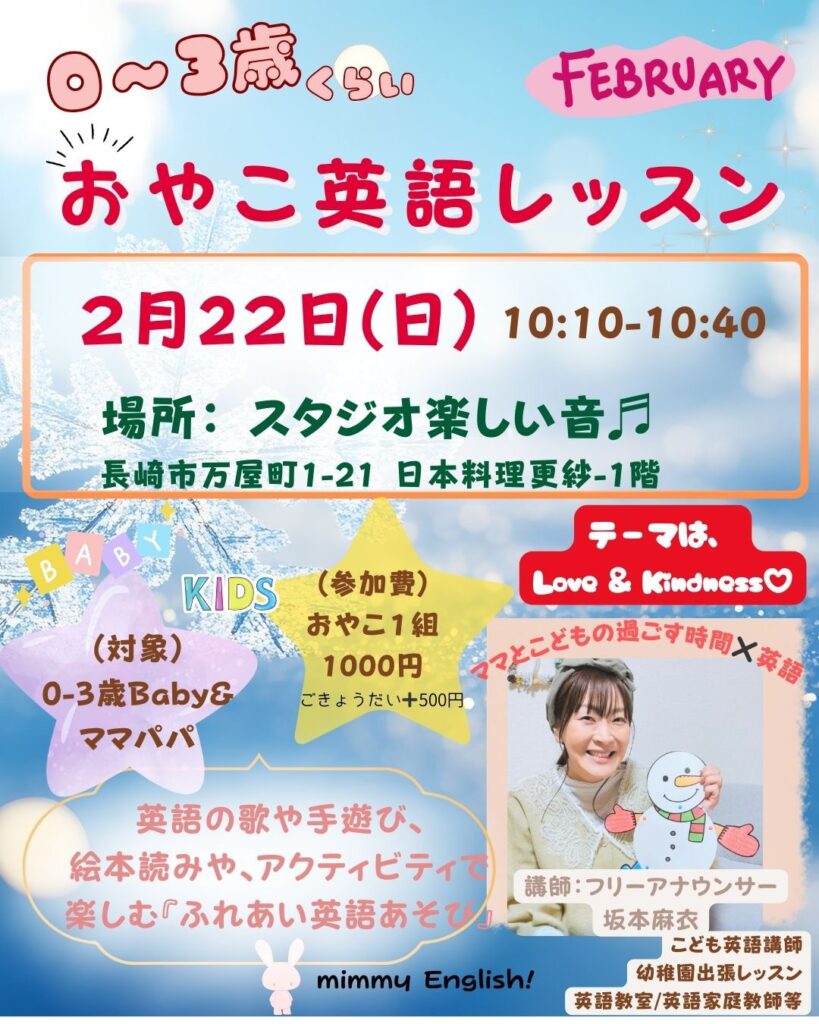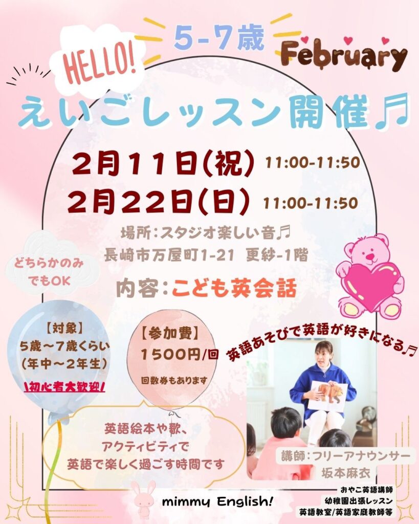 ・月に1度、長崎市日吉幼児園にて出張英語レッスン(幼稚園向け英語レッスンはこちら)